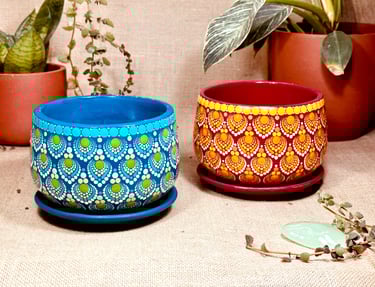 All terracotta pots that we use are completely handmade by local artisans and all mandala patterns and designs are hand-painted - so there might be a slight degree of variation in size and mandala patterns from product to product, however we guarantee a 90% similarity in case you plan to purchase multiple copies of the same product.